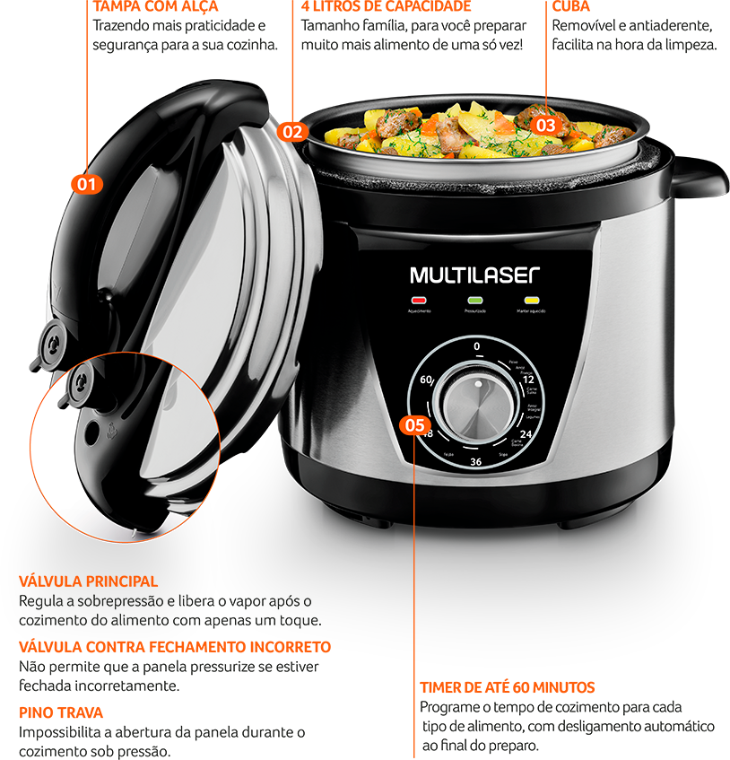 Além disso, a Panela de Pressão Elétrica da linha Multilaser Gourmet possui um lindo design com acabamento aço inox, trazendo sofisticação e durabilidade à sua cozinha!