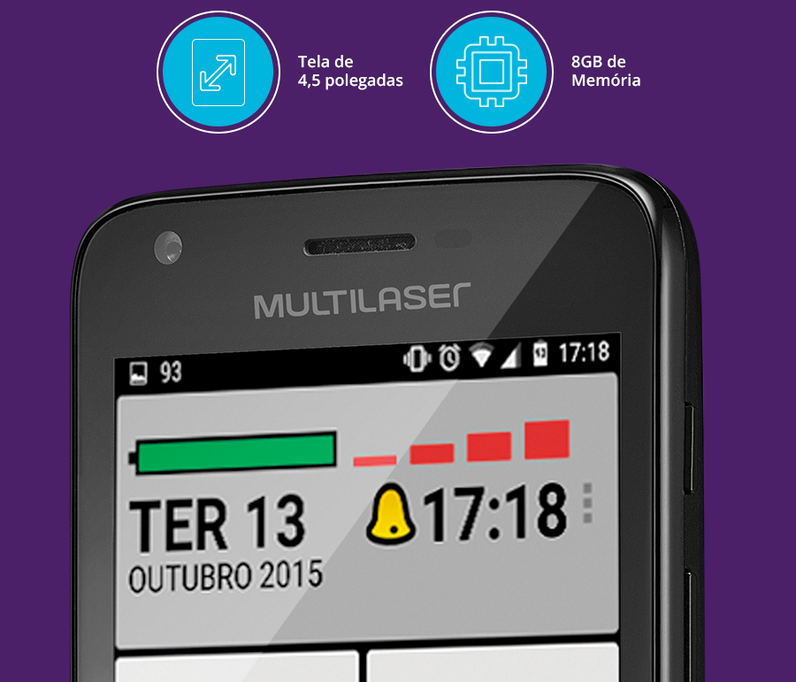 O MS45S Sênior possui uma tela de 4,5 polegadas, ideal para uma fácil visualização das suas tarefas no aparelho. Além disso, são 8GB de memória interna, que pode ser expandida para até 32GB com um cartão de memória micro SD*.