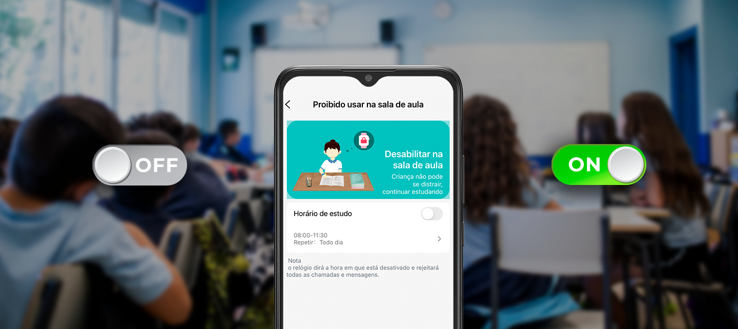 Com a função “Proibido usar na sala de aula” a criança fica impossibilitada de receber mensagens e ligações, assim ela não se distrai nas horas de estudo e pode se concentrar no que realmente importa.